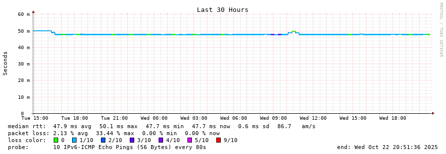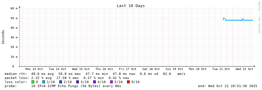 traceroute to 2001:4350:1:1::ff90 (2001:4350:1:1::ff90), 30 hops max, 80 byte packets - Generated at 2025-10-22 20:45:02