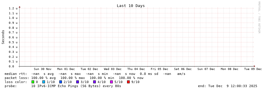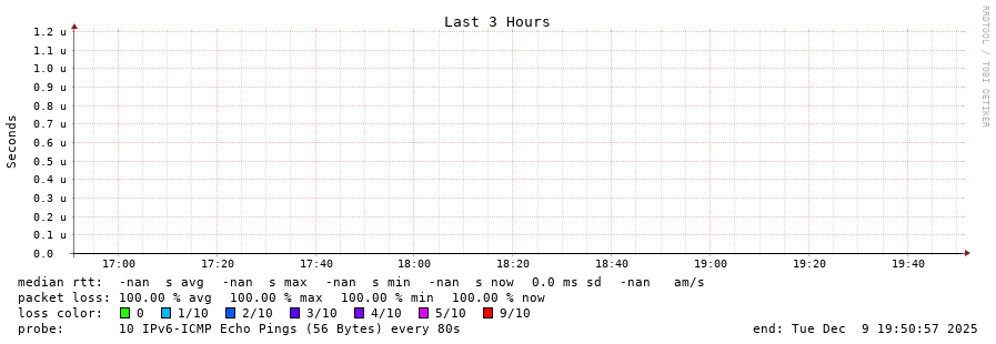 traceroute to fd69:226f:3a3c::2 (fd69:226f:3a3c::2), 30 hops max, 80 byte packets - Generated at 2025-12-07 15:15:01 3 > 4 > 5 > 6 > 7 > 8 > 9 > 10 > 11 > 12 > 13 > 14 > 15 > 16 > 17 > 18 > 19 > 20 > 21 > 22 > 23 > 24 > 25 > 26 > 27 > 28 > 29 > 30 >