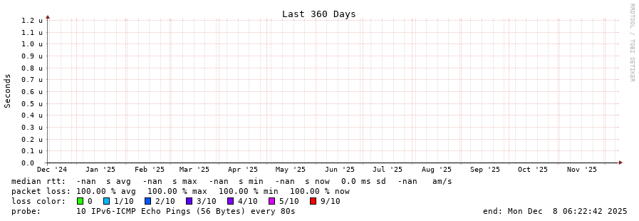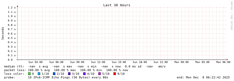 traceroute to fd69:226f:3a3c::2 (fd69:226f:3a3c::2), 30 hops max, 80 byte packets - Generated at 2025-12-07 17:00:01 3 > 4 > 5 > 6 > 7 > 8 > 9 > 10 > 11 > 12 > 13 > 14 > 15 > 16 > 17 > 18 > 19 > 20 > 21 > 22 > 23 > 24 > 25 > 26 > 27 > 28 > 29 > 30 >