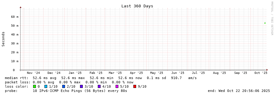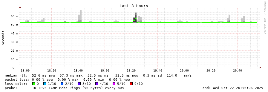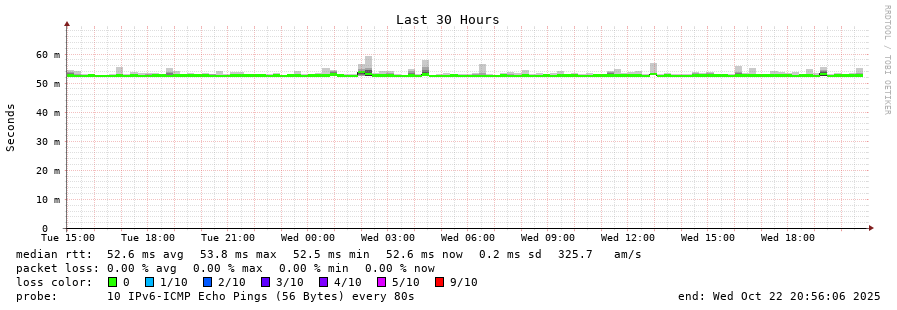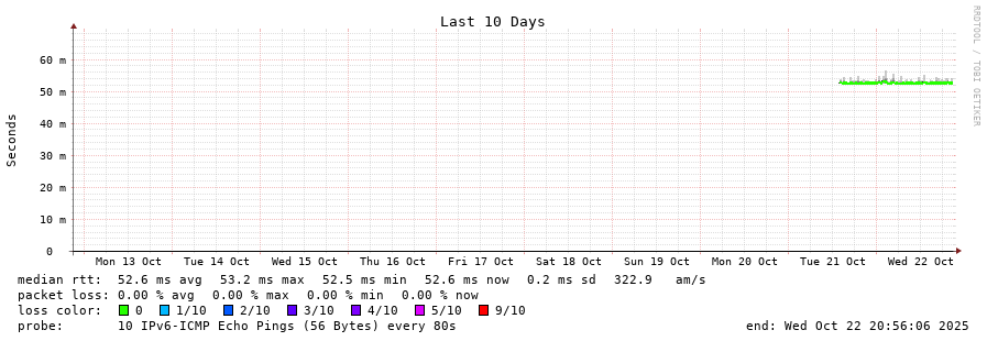 14 > 2001:67c:1e0:0:c225:e9ff:fea8:6a0a (2001:67c:1e0:0:c225:e9ff:fea8:6a0a) [AS31554] 52.486ms 52.602ms 52.428ms